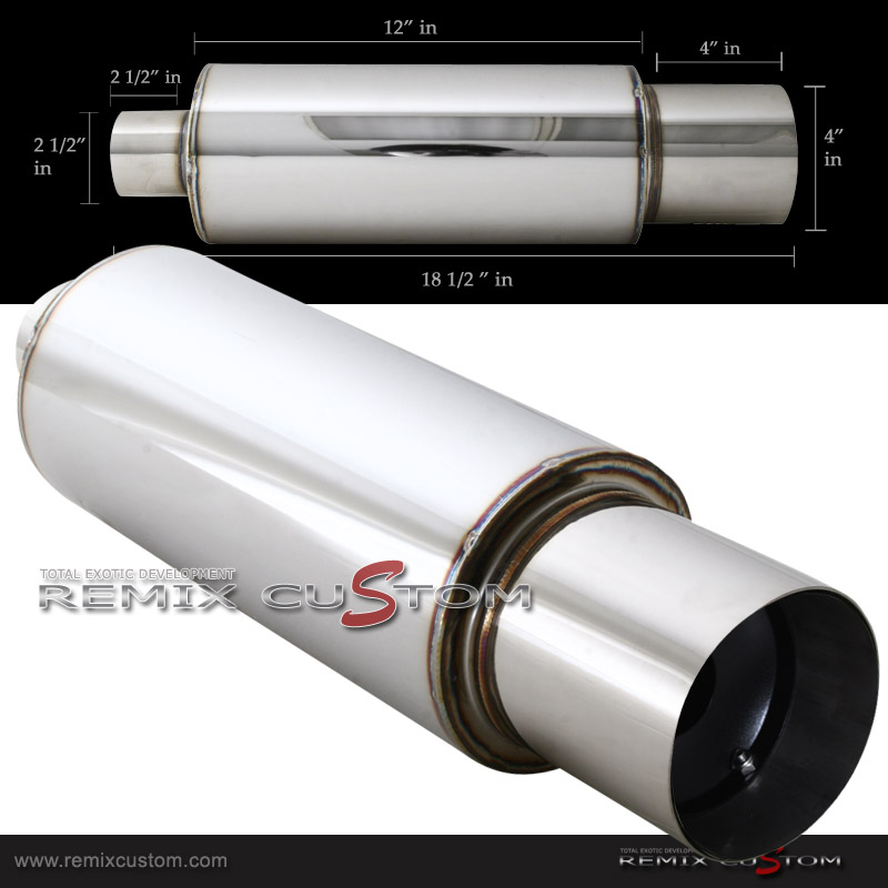 Full T-304 Austenintic Stainless Steel Construction. Designed and constructed to maximize your vehicle's power with this straight through concept. Hi-Power Muffler incorporate a race inspired angled mounted stainless steel muffler and piping design. ULTRA FAST FLOW STRAIGHT THOUGHT DESIGN HIGH GLOSS POLISH FINISH SPORTY DEEP TONE with a smooth & deep sound