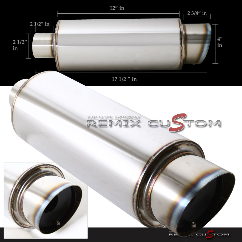 Full T-304 Austenintic Stainless Steel Construction. Designed and constructed to maximize your vehicle's power with this straight through concept. Hi-Power Muffler incorporate a race inspired angled mounted stainless steel muffler and piping design. ULTRA FAST FLOW STRAIGHT THOUGHT DESIGN HIGH GLOSS POLISH FINISH SPORTY DEEP TONE with a smooth & deep sound