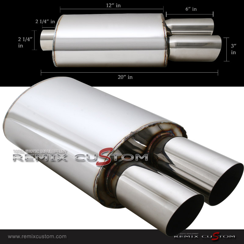 Full T-304 Austenintic Stainless Steel Construction. Designed and constructed to maximize your vehicle's power with this straight through concept. Hi-Power Muffler incorporate a race inspired angled mounted stainless steel muffler and piping design. ULTRA FAST FLOW STRAIGHT THOUGHT DESIGN HIGH GLOSS POLISH FINISH SPORTY DEEP TONE with a smooth & deep sound