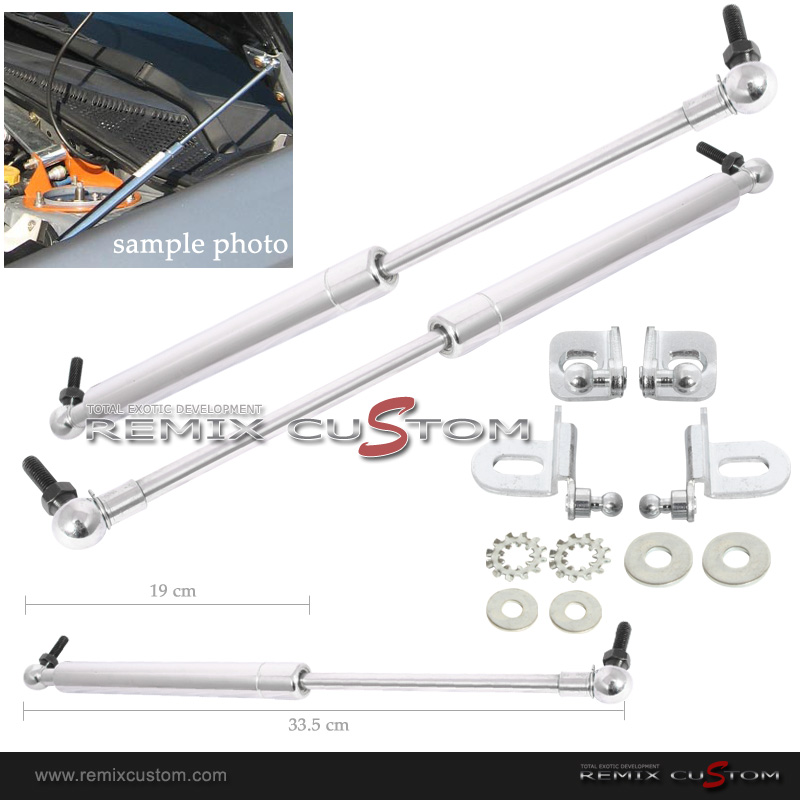 Engine Hood Damper Kits are designed to eliminate the use of stock hood support stand, and make it easier for opening and closing the hoods. It will assist you in lifting large and heavy hoods, it also keeps the hood opens and stays at a greater angle for better access of the engine bay when working on your vehicle. Each kit features 2 dampers with chrome polish body, adaptor plates to anchor the dampers, and the hardware needed for installation.