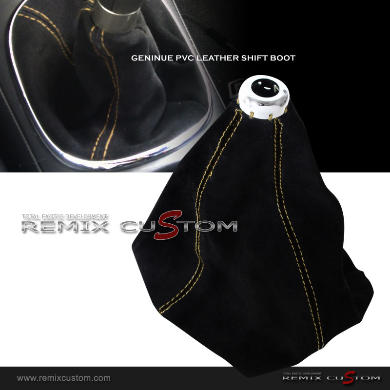 This is a Universal Black Suede Shift Boot with Yellow Stitch for most car models with stick shift. This Black Suede Shift Boot is made with high quality suede leather and accented with Red stitch. It is a perfect add on or replacement for your current shift boot. It is a universal fit and simple to install. Get this Black Suede Shift Boot today and give your car interior a fresh and upgraded appearance.